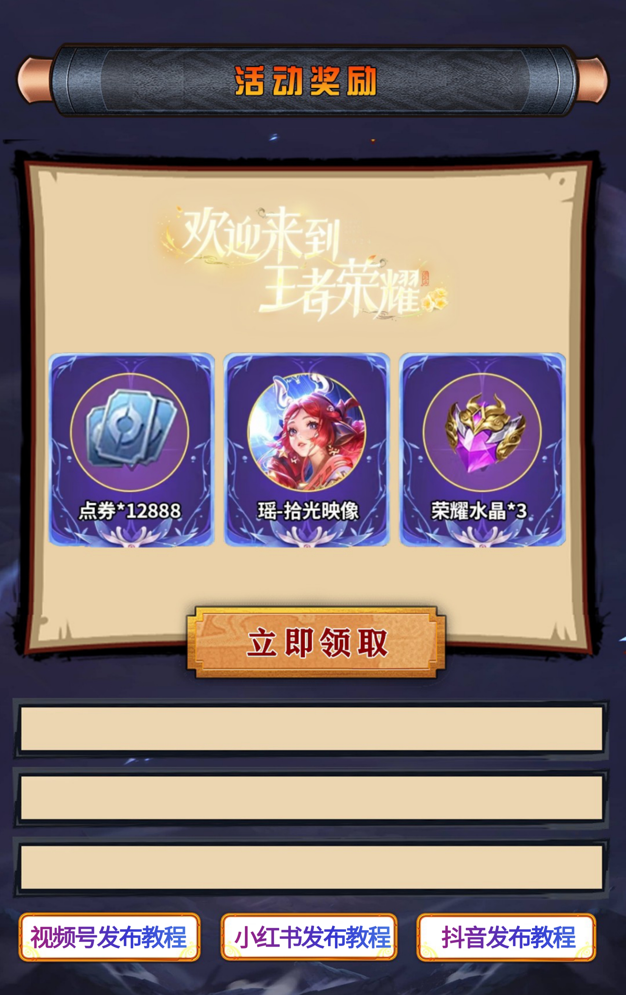要在小红书/视频号/抖音极速版等平台发布“3条”本网站内的不同视频和对应文案,即可获得「王者荣耀」活动礼包哦!!