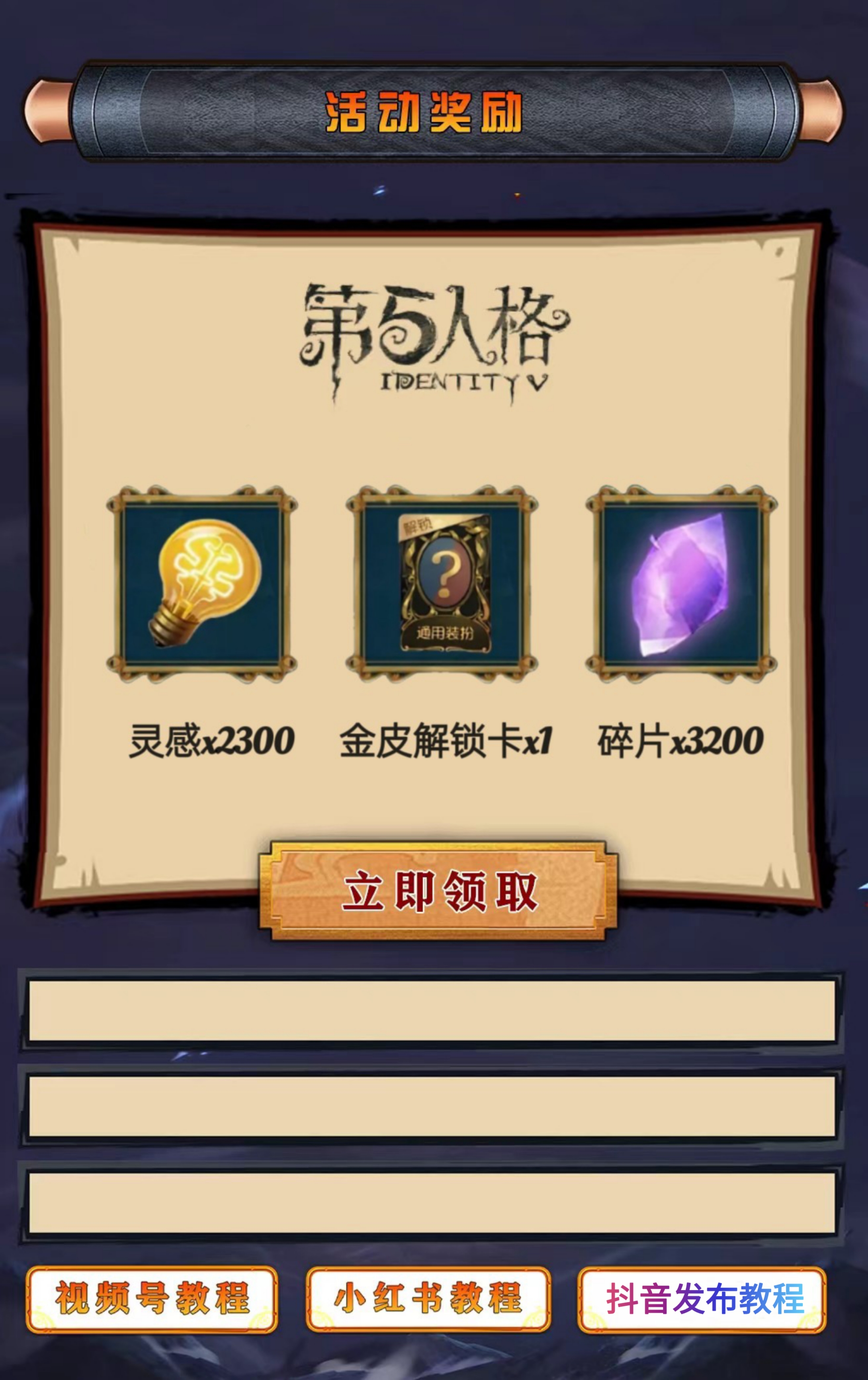 要在小红书/视频号/抖音等平台发布“3条”本网站内的不同视频和对应文案,即可获得「第五人格」活动礼包哦!!